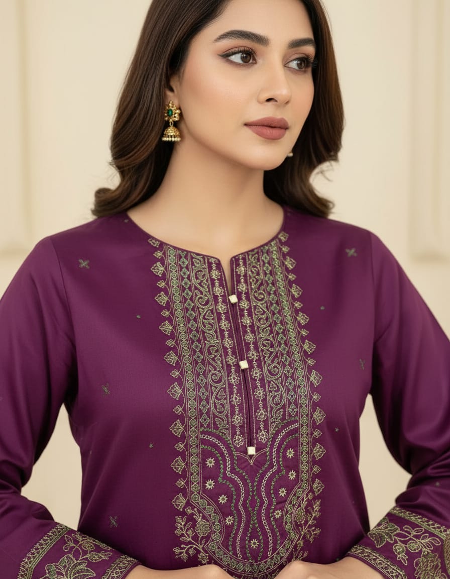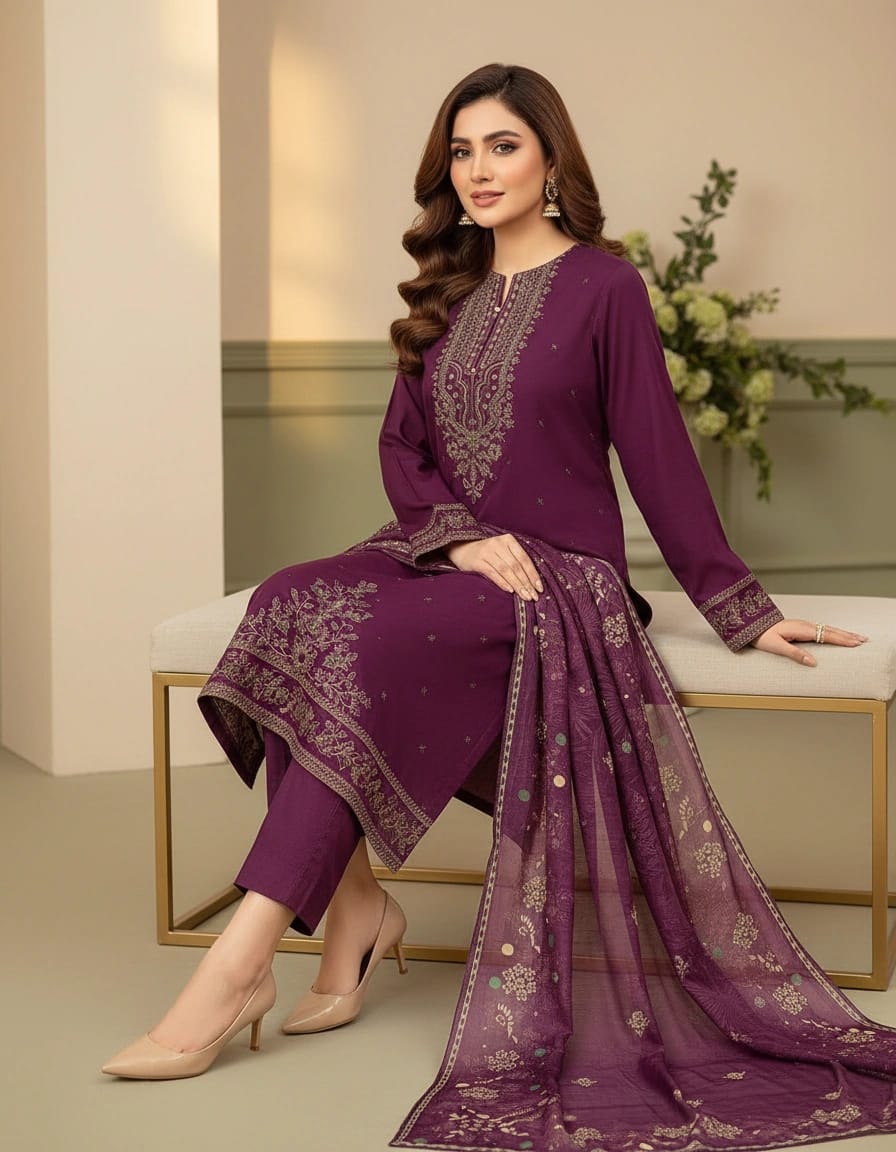 Plum Elegance is a refined ensemble crafted in rich plum lawn cotton, offering breathable comfort with an elegant finish. The shirt features intricate embroidery on the front, enhanced by a beautifully detailed embroidered daman border. The sleeves are delicately embroidered, adding sophistication and balance to the silhouette.