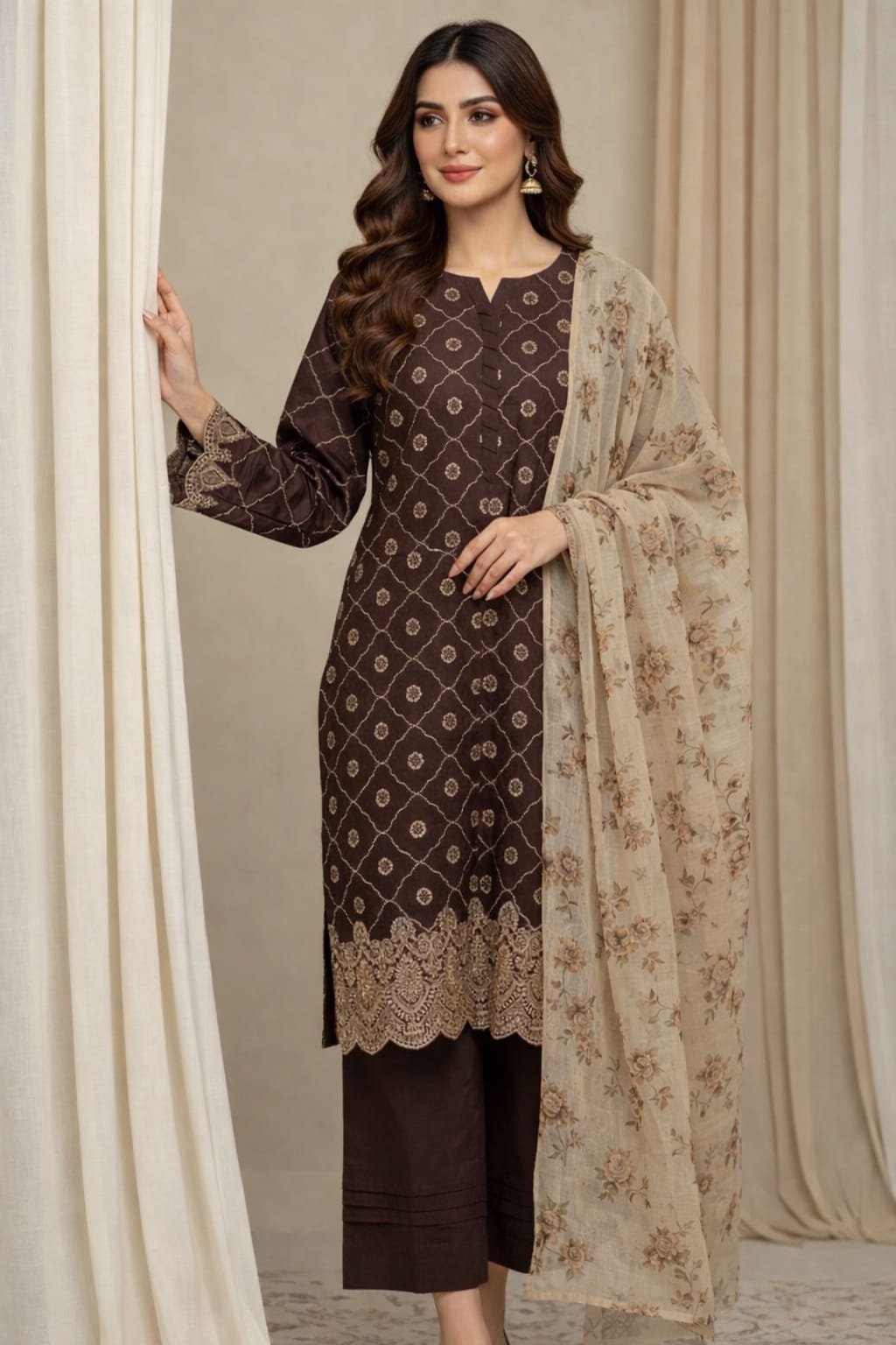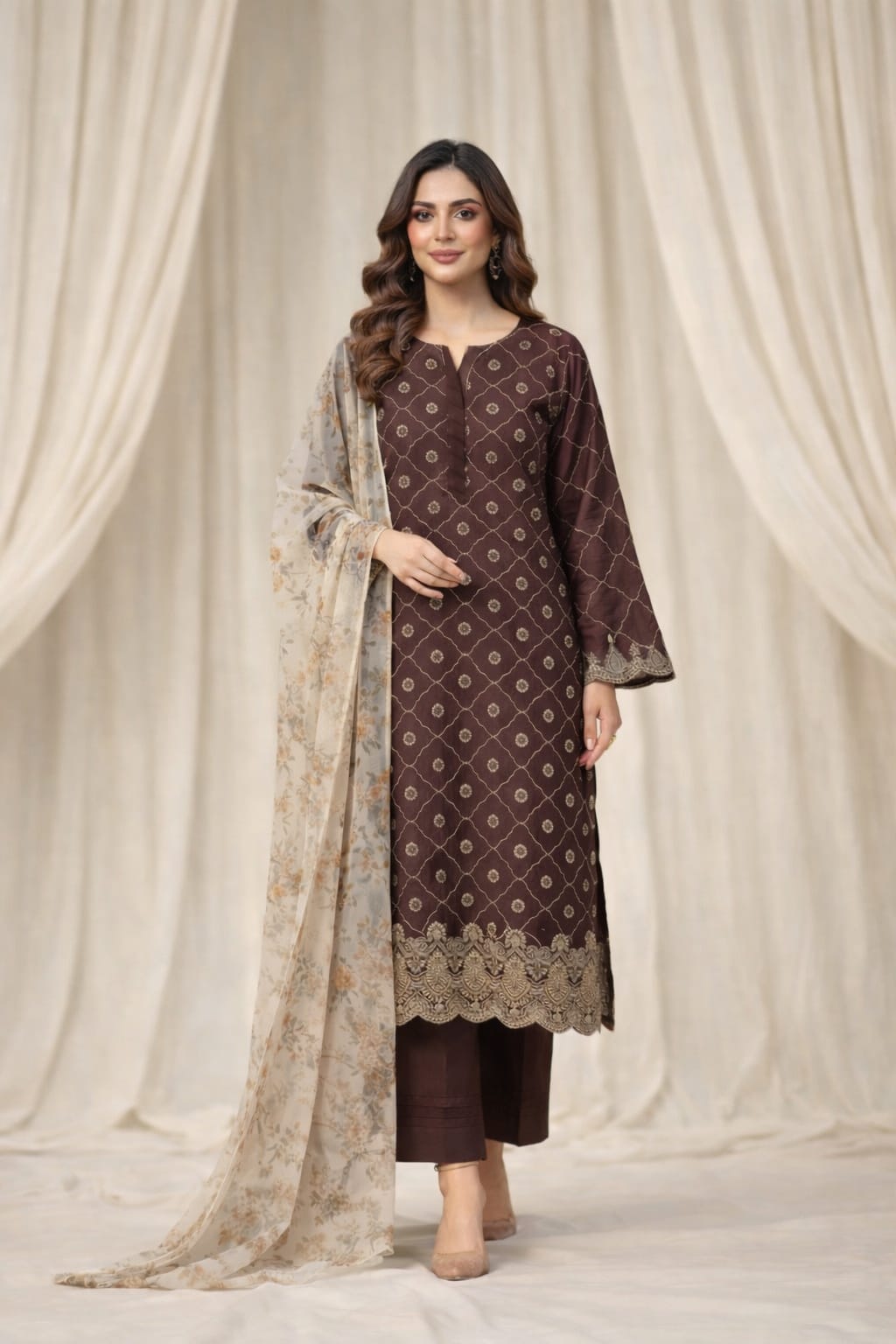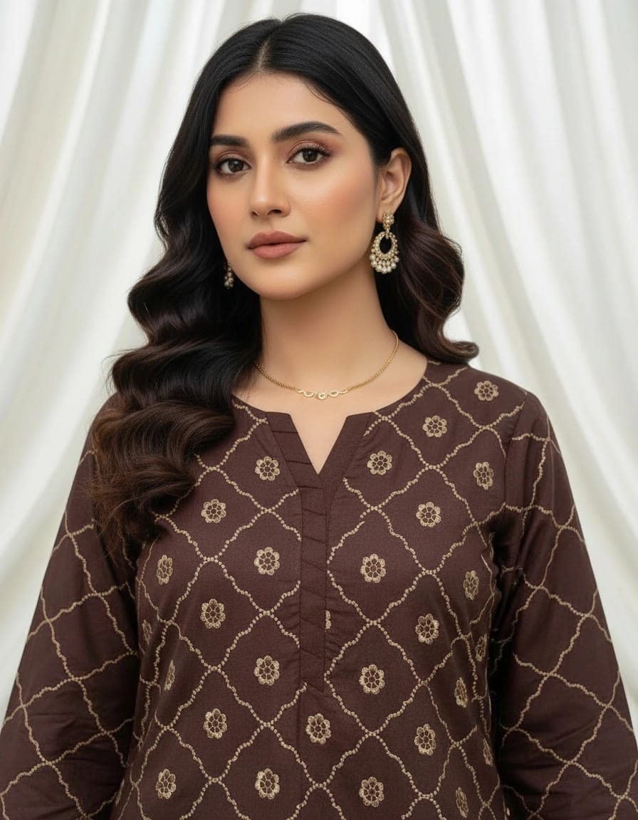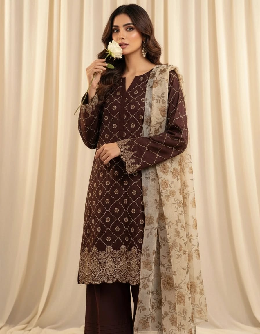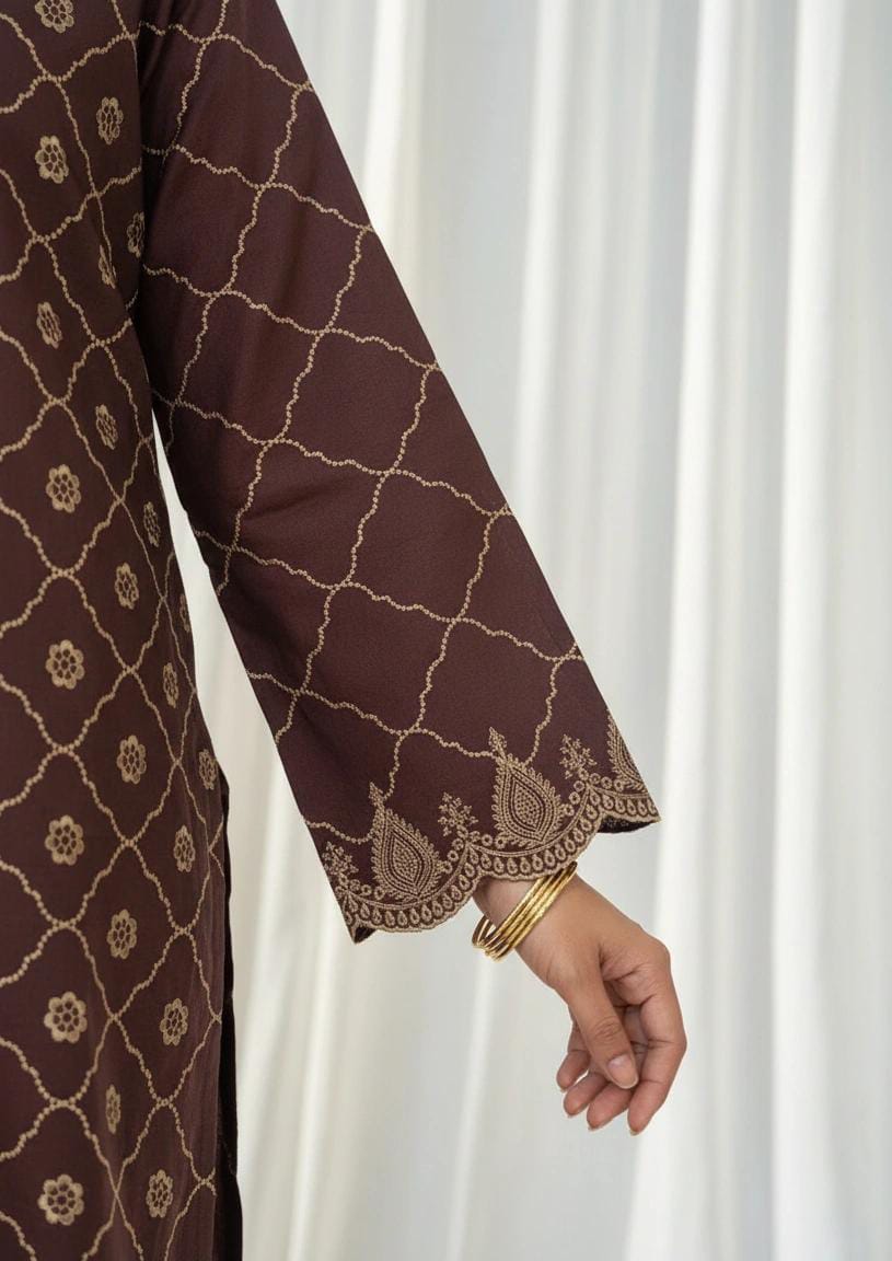 Shehnai is a rich and graceful ensemble inspired by timeless desi elegance. The deep chocolate brown shirt features a fully embroidered front adorned with intricate patterns, beautifully complemented by fully embroidered sleeves and a detailed embroidered daman border. The plain back keeps the silhouette refined and balanced.
